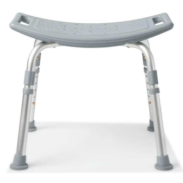 Corrosion-resistant, lightweight aluminum construction provides lasting support for up to 300 lbs. Drainage holes are easy-to-clean and reduce the risk of slipping Ergonomic design featuring a curved seat with handles and angled legs on non-skid tips for enhanced comfort and stability Height adjusts in 1-inch increments using pinch-free, push-button design with an audible click to ensure secure positioning Removable back to accommodate user's needs and preferences Tool-free assembly Added support collar prevents leg movement and reduces rattle Not Made with Natural Rubber Latex